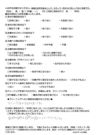歯根の手術を専門の先生にしてもらえた(40代女性・来院約1年目) 歯根の手術を専門の先生にしてもらえた(40代女性・来院約1年目) 2021年2月10日 山下スマイル歯科スタッフ ◆クリーニング後は気持ち良いです。◆歯根の手術を専門の先生にしていただけたこと ◆スタッフからの感謝コメント◆口腔外科認定医の先生による診察日に合わせてお越しくださりありがとうございます。一般歯科ではなかなか難しい症例も当院で行えています術後も良好でよかったです